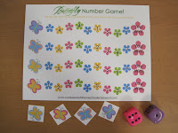 Butterfly dice game: goal is to roll the die and move your piece to the next spot containing your rolled number. First one to the flower wins!